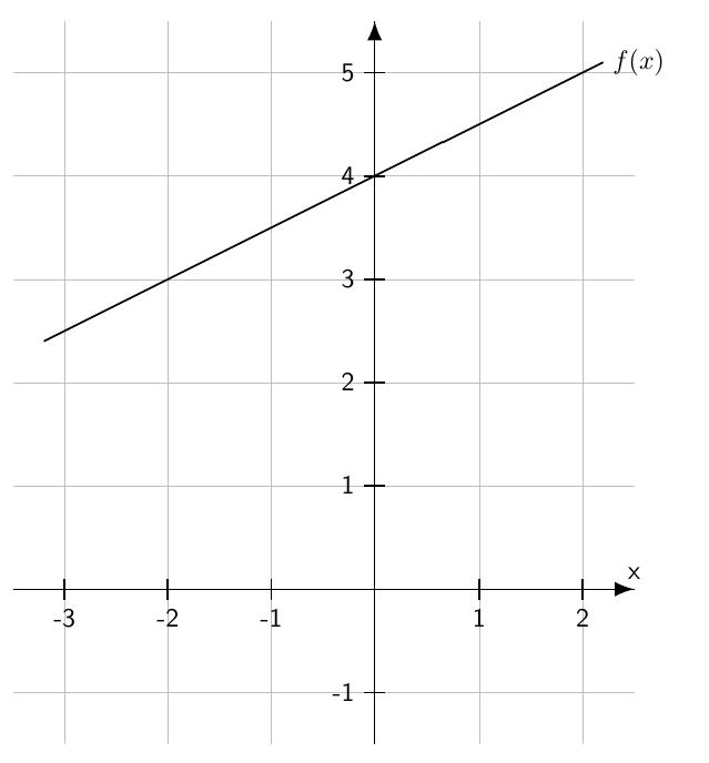 $$a=\frac{\Delta y}{\Delta x}=\frac{y_B-y_A}{x_B-x_A}=\frac{5-4}{2-0}=\frac{1}{2}$$\begin{align}f(x)=\frac{1}{2}x+4\end{align}